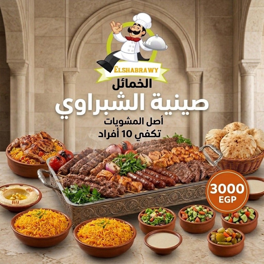 اطلب صينية الشبراوي للمشويات تكفي 10 أشخاص من مطعم الشبراوي بالخمائل. كباب، استيك، كفتة، طرب، سجق، وفراخ على الفحم مع الأرز. أصل الأكل الشرقي.