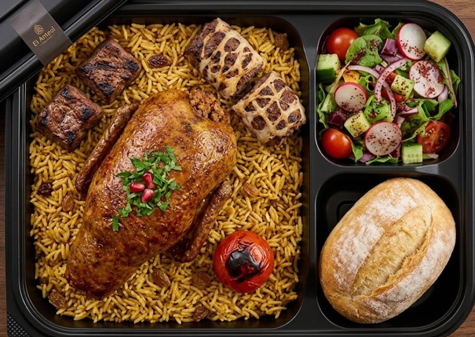 وجبة العنتيل من مطعم الشبراوي بالخمائل وزايد. فرد حمام محشي بالخلطة السرية مع ميكس كباب وطرب ضاني وأرز بسمتي. أصل الأكل الشرقي اللي بيظبط الدماغ للأكيلة.